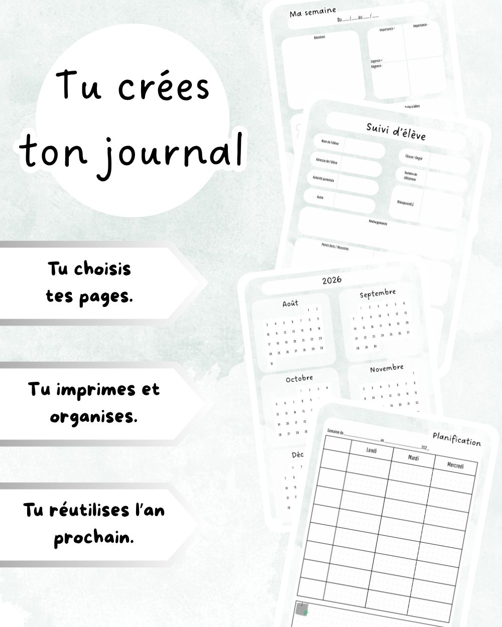 Ce journal contient 13 pages modulables, à imprimer selon tes besoins :