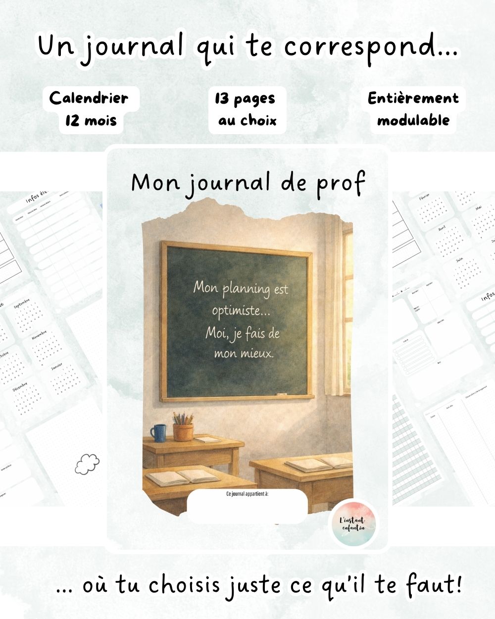 13 pages modulables à réutiliser chaque année, avec le calendrier mensuel offert à télécharger.
