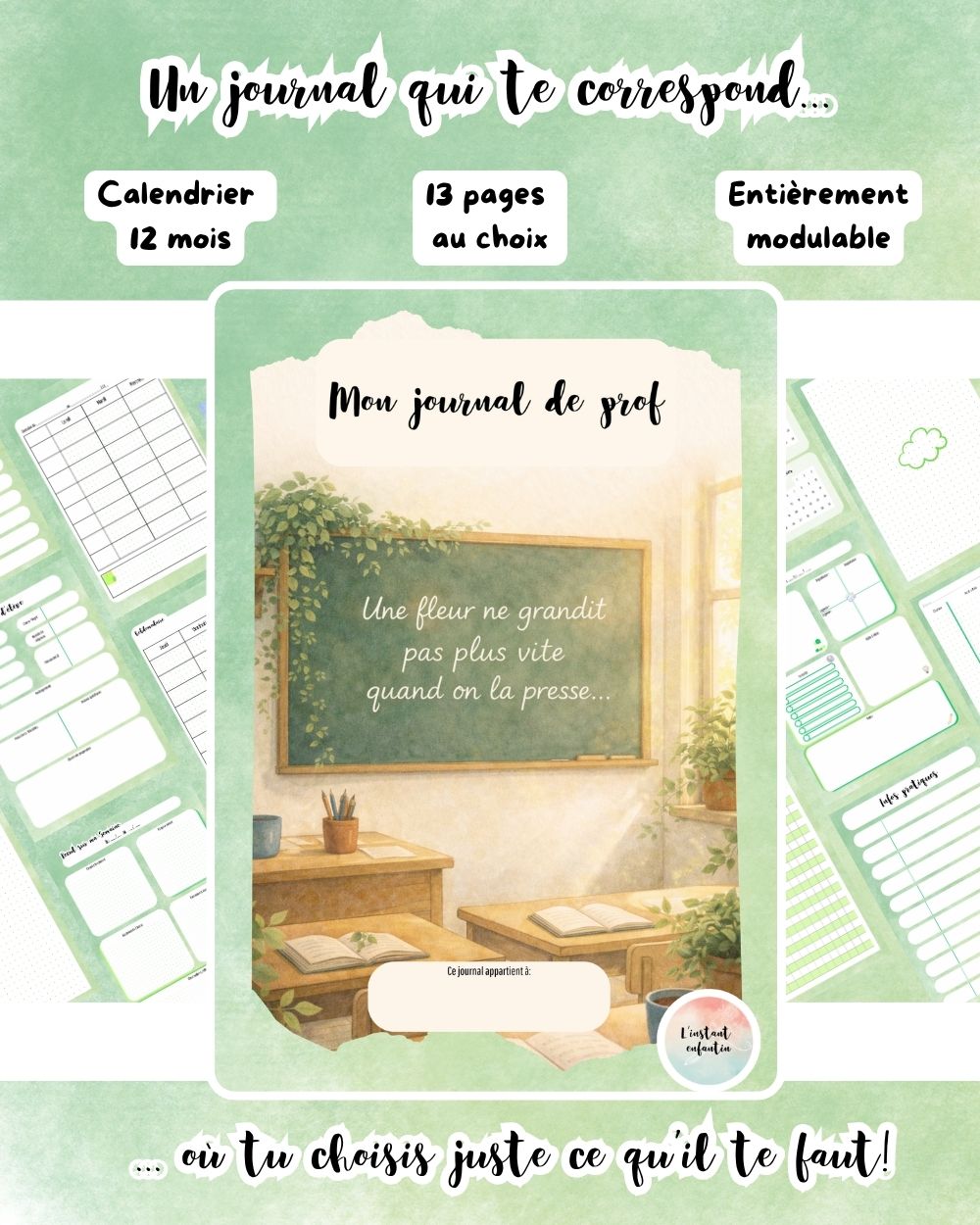 13 pages modulables à réutiliser chaque année, avec le calendrier mensuel offert à télécharger.