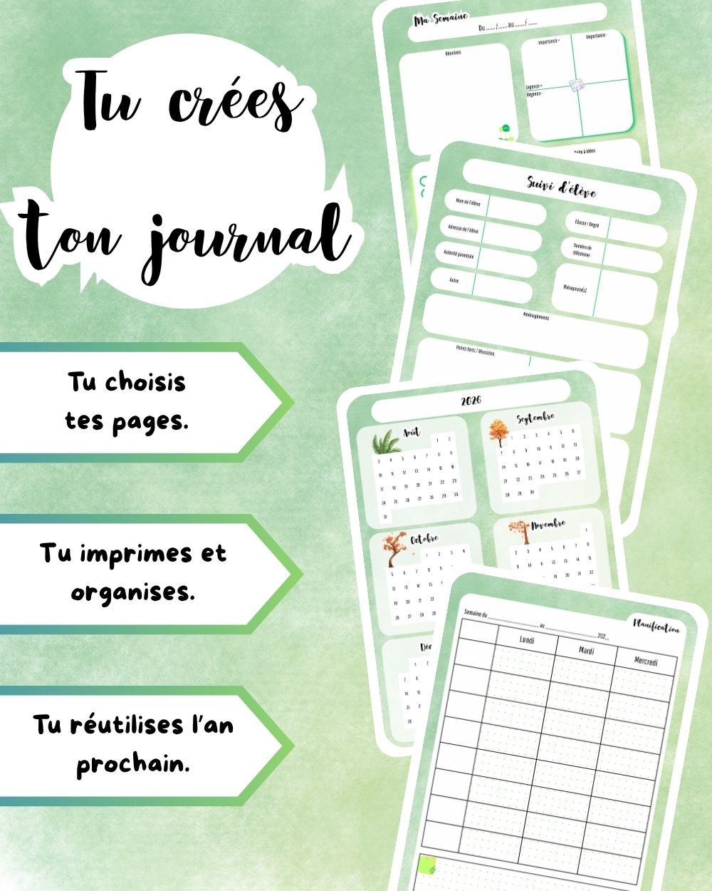 Ce journal contient 13 pages modulables, à imprimer selon tes besoins :